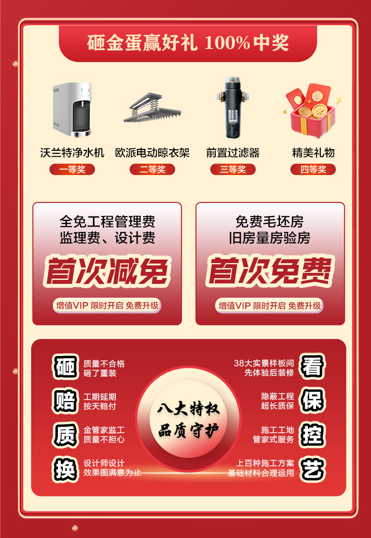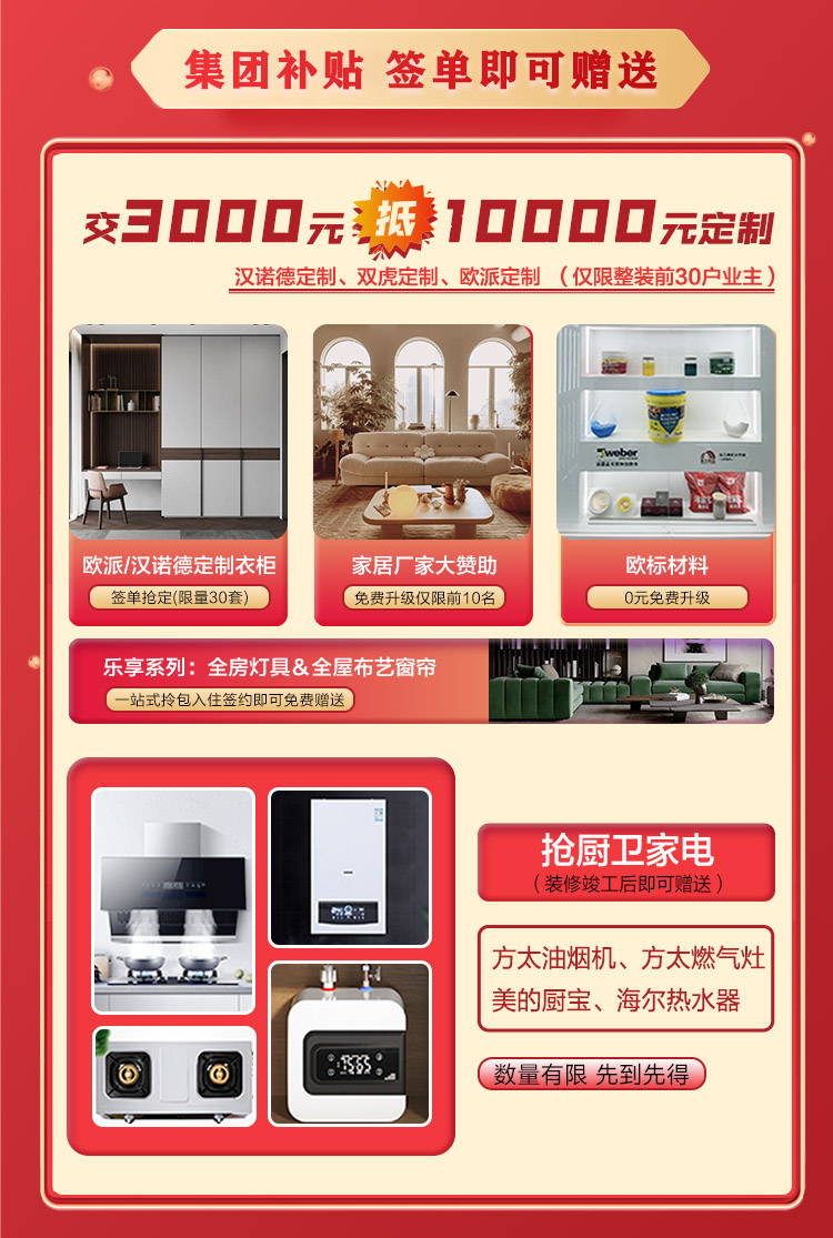為表達我們的誠摯謝意,本次活動推出3000元抵10000全屋定制系列升級,并且簽約即可贈送全屋燈具窗簾,更有廚衛家電限時相送,另外我們精心準備的簽約砸金蛋中大獎,100%中獎率。